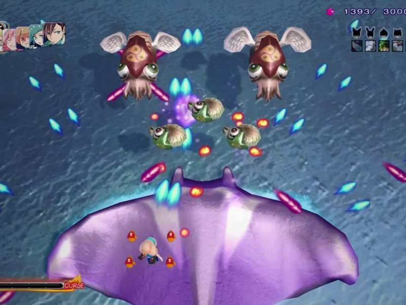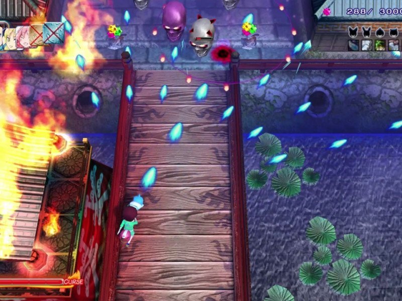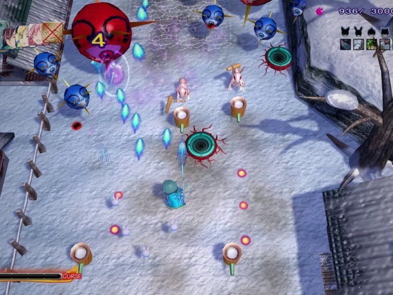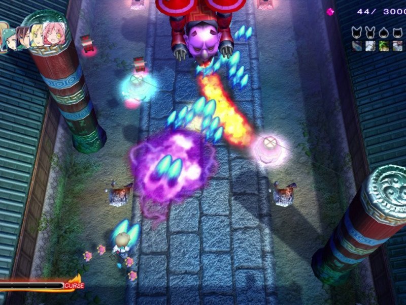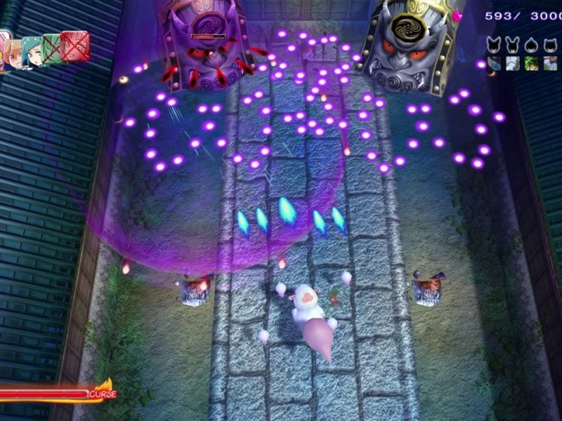 Dans Mamorukun ReCurse!, l'écran ne se déplace pas automatiquement , mais suit les mouvements que vous assignez à votre personnage. Attention cependant : si l'écran « se lève », vous ne pourrez plus revenir en arrière. Quant aux autres capacités, le système de jeu évolue au gré des changements de règles, permettant d'utiliser un personnage unique ou une équipe créée spécialement pour le jeu, incluant des personnages DLC issus de différentes éditions postérieures à 2008. La durée de vie et la difficulté sont intimement liées et dépendent fortement de l'expérience du joueur. De par sa conception, Mamorukun ReCurse! est assez difficile et gratifiant, même s'il manque d'originalité. Le principe est simple : il faut tirer sur tout ce qui bouge. La véritable exception réside dans les fameuses « balles maudites », qui peuvent être utilisées stratégiquement selon vos objectifs. Plus vous maintenez le bouton de tir enfoncé, plus elles peuvent maudire les ennemis et vous-même, et toucher des zones proches ou éloignées. Mais en quoi consiste cette malédiction ? Si vous êtes maudit, vous gagnerez des bonus de puissance et de vitesse , mais vous ne pourrez pas tirer de projectiles maudits. Une fois la malédiction dissipée, vous subirez un malus. Les ennemis maudits, quant à eux, subissent des dégâts continus et rapportent un bonus de score important en cas de victoire. De plus, les projectiles maudits génèrent une onde de choc bénéfique qui détruit les projectiles ennemis à l'écran, offrant une brève invulnérabilité.